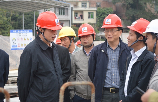 11月23日,自治區交通運輸廳廳長潘巍蒞臨那坡至平孟口岸公路施工現場檢查指導工作,集團公司董事長朱堅和、百色市副市長陶榮鉛等相關領導陪同檢查。