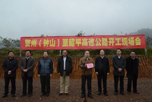 按照自治區的統一部署,12月29日上午10時,2015年全區高速公路重大項目開竣工現場會第五分會場——賀州至巴馬高速公路(鐘山至昭平段)開工現場會在賀州市昭平縣舉行。集團公司副董事長、總經理、黨委副書記唐咸秋,總工程師覃炳賢,賀州市副市長閉海東等有關領導出席會議;賀州市、桂林市、昭平縣、鐘山縣、平樂縣等項目沿線各級政府領導和相關部門負責人以及廣西新恒通高速公路有限公司等有關單位代表約30人參加會議,共同見證項目開工建設。唐咸秋主持開工現場會,覃炳賢介紹項目概況,項目沿線有關政府部門代表表態發言,閉海東宣布項目正式開工建設。