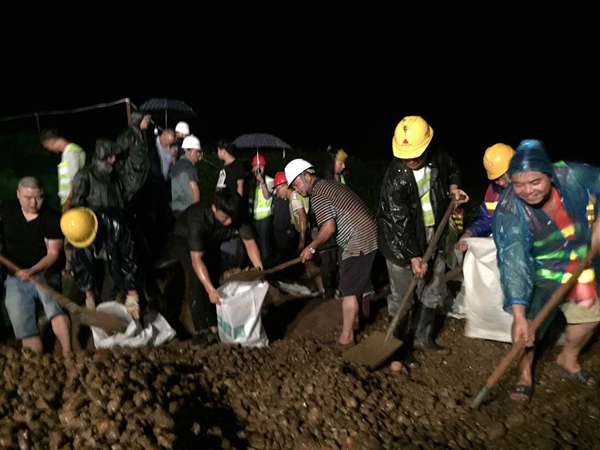 “十萬壟大堤出現險情,大家快去救援。”7月1日21時,湖南省湘潭市,廣西路橋集團環東路項目經理部項目常務副總工程師宋佩超立即組織項目經理部員工一起奔赴一線。當時湘潭市十萬壟湘江大堤出現直徑約20公分左右管涌,情況十分緊急,附近的新馬路項目部出動挖掘機和裝載機進行搶險救援。同時,項目經理部全體員工與當地救援隊伍一起排起了長龍,齊聲喊著口號“一二”、“一二”裝沙袋、傳運沙袋,幫助封堵大堤漏洞。