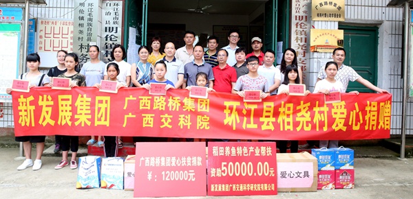 8月18日,廣西新發展交通集團到環江縣明倫鎮相堯村開展愛心助學金和產業發展基金捐贈活動,向相堯村貧困學子捐贈文體用品、學習用具、愛心款,資助相堯村稻田養魚特色產業。