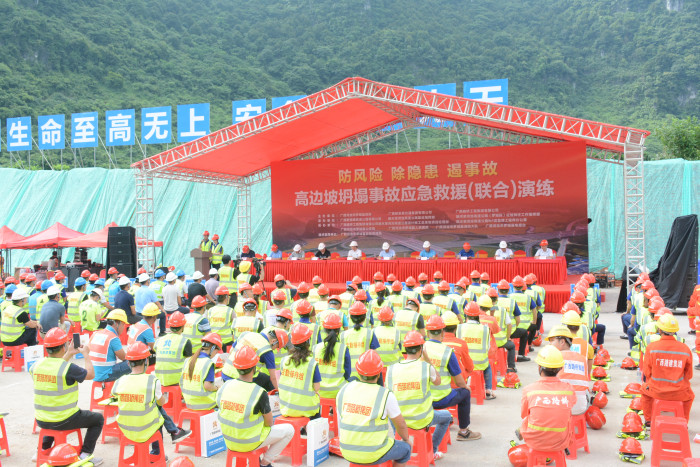 作為“防風險 除隱患 遏事故”主題“安全生產(chǎn)月”活動內(nèi)容之一,該演練結合融水至河池高速公路項目施工中存在的高邊坡坍塌重大危險源的特點,旨在加強參建人員安全防范意識,提高安全應急處置、救援能力。