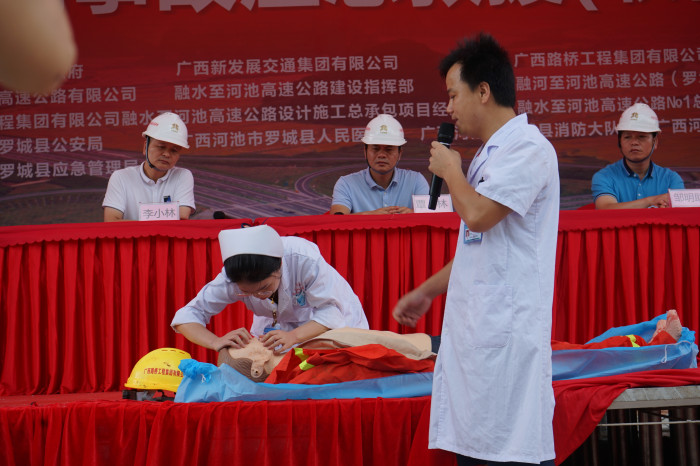 當天的演練現(xiàn)場模擬情景為:2019年6月20日,在羅城縣四把鎮(zhèn)沖灣屯附近,融河高速公路K54+100高邊坡處現(xiàn)場4名邊坡防護作業(yè)人員正在緊張的施工,由于連續(xù)雨天上邊坡坡頂土體部分突然滑落,繼而出現(xiàn)大的滑坡裂縫,隨之大面積土石體坍塌,1名施工人員被垮塌的土石壓埋。事故發(fā)生后,參與演練人員及時報告和啟動應急預案,在坍塌現(xiàn)場設置臨時指揮部,指揮現(xiàn)場救援,將傷者抬出被困位置后,在演練會場進行現(xiàn)場醫(yī)療和急救演示,再由救護車送到羅城縣人民醫(yī)院進一步治療。